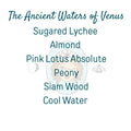 She is pink, she is sweet, and she is addictively refreshing. The Ancient Waters of Venus calls to mind a truly ethereal goddess, basking in prisms of pink light and rising mists. The scent starts out sweet and bright and juicy, with sugared lychee grounded in a hint of almond, and the aquatic floral notes of lotus peaking through. As the scent dries, it becomes a soft, delicate (stays close to the body) scent grounded in peony, lotus, and siam wood, with the refreshing notes of cool water and rising mist and the memory of lychee lingering in the air.
