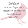 Notes: hazelnut cappuccino • raspberry body spray • pear shampoo • warm skin