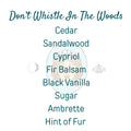 In the Appalachian mountains (and in many cultures across the world), it’s said that you shouldn’t whistle in the woods at night, or you may be answered by a creature who means you harm. Deep, dark woods meet their match in sugared black vanilla, and a glimmer of fur is a reminder of what awaits you if you don’t make it inside by nightfall.