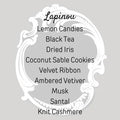 Notes: Lemon Candies • Black Tea • Dried Iris • Coconut Cookies • Velvet Ribbon • Ambered Vetiver • Musk • Santal • Knit Cashmere