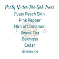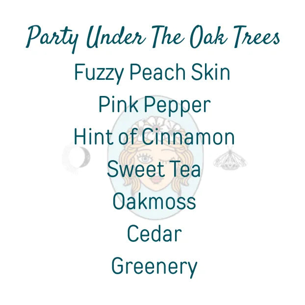 This scent replicates the experience of standing in a grove of oak trees, with dappled sunshine peaking through and warming your skin. The peaches are whole, ripe, and warmed by the sun, so you can smell the fuzzy peach skin wafting through the air and hinting at the fruit's juicy contents. Sweet tea and whipped cream are whispers in the background, ready for the party.
