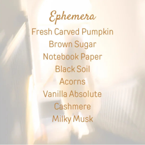 Inspired by autumns past, Ephemera is a meditation on the delights and fleeting nature of the season. At once sweetly nostalgic and softly wistful, Ephemera opens with freshly carved pumpkin and quickly nestles into a cozy and gourmand combination of brown sugar, nutty acorns, notebook paper and black soil.