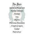 The Bees opens with a bright, realistic honey aroma created with a natural honey extraction, paired with jasmine and mimosa absolutes, petrichor, and a fuzzy note of pollen. As the fragrance wears on the skin, the lingering honey aroma begins to swirl with creamy iris, fresh cream and aromatic myrrh to create a cozy, your-skin-but-better scent.