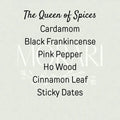 Cardamom, Black Frankincense, Pink Pepper, Ho Wood, Cinnamon Leaf, Sticky Dates